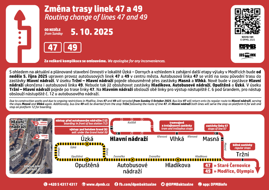S ohledem na stavební práce v lokalitě Úzká – Dornych (staré Tesco), pravděpodobné omezení na ulici Hladíkova na počátku příštího roku a zahájení další etapy výluky v Modřicích, bude trasa linek 47 a 49 v centru města dočasně upravena.